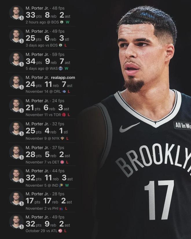 自从离开掘金,很少看到小迈克尔-波特的新闻。其实他最近打得不错,过去8场比赛,小波特在篮网场均砍下27.8分7.5篮板3.3助攻,投篮命中率50.3%,三分命中率40.6%。赛季至今,小波特打了14场比赛,其中5场砍下30+!