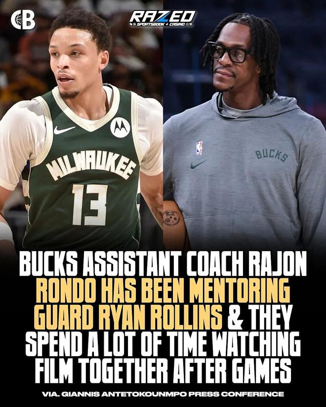 而这两场连续爆发,有一个关键的细节:在第三场败给骑士之后,字母哥透露说,罗林斯跟隆多花了一个半小时时间研究比赛录像。而隆多在过去一段时间内一直在担任罗林斯的导师角色。