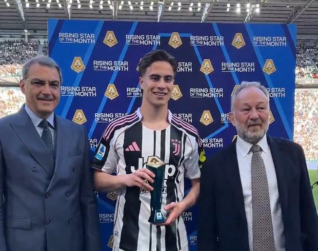 北京时间4月6日,在意甲第31轮尤文图斯主场迎战热那亚的比赛开始前,斑马军团的前锋凯南-伊尔迪兹领取了意甲3月最佳新星的奖杯,并与俱乐部主席詹卡洛-费雷罗和CEO达米安-科莫利合影。