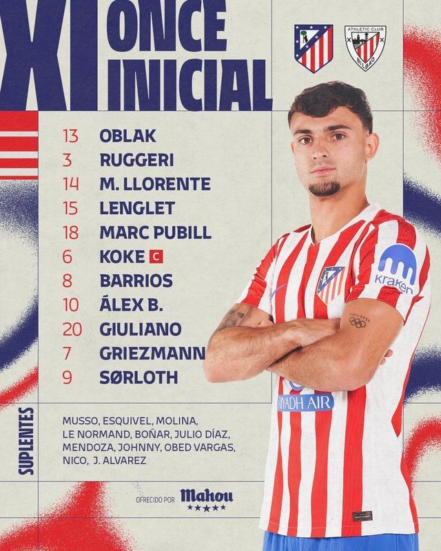 马竞首发:13-奥布拉克、3-鲁杰里、14-马科斯-略伦特、15-朗格莱、18-马克-普维尔、6-科克、8-巴勃罗-巴里奥斯、10-巴埃纳、20-朱利亚诺-西蒙尼、7-格列兹曼、9-瑟洛特